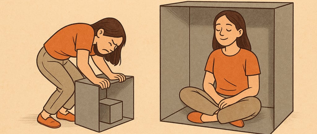 Na psicanálise, sabemos que o sujeito se constitui na relação com o Outro. Se eu aceito qualquer caixa, é porque talvez ainda não tenha me autorizado a ocupar a minha. A caixa justa aquela em que posso sentar, respirar e estar inteiro simboliza o encontro com meu próprio desejo, a possibilidade de habitar o espaço onde meu eu verdadeiro se reconhece.