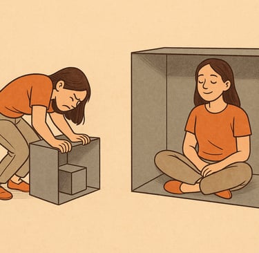 Muitas vezes, tentamos nos encolher para caber em caixas que não nos pertencem. Essas caixas representam expectativas externas, exigências do Outro, lugares onde buscamos reconhecimento e amor, mas que, na verdade, nos negam. O esforço de caber onde não há espaço não é apenas desconfortável: é repetição. Repetição de padrões inconscientes de não merecimento, de silenciamento e de busca de validação em territórios de falta.